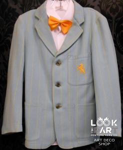 Super smart blazer in soft aqua with a fine yellow stripe. 'Rampant Lion' emblem on pocket.