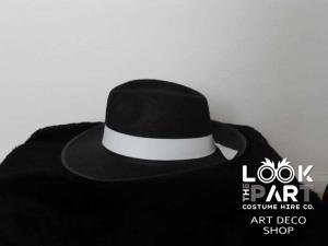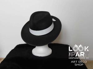 Fabulous black fedora hat with a white band. Team it up with some braces to get the perfect Mafia look. Add some of our black & white shoes & you’re good to go.