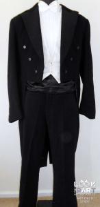 Black tails jacket, Black trousers, White 'dickie'waistcoat, White bow tie, Black cumberband