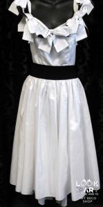 Snazzy white satin dress with black bow accents at neckline.