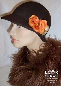 BROWN FELT HAT TRIMMED WITH ORANGE FLOWERS.